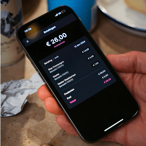 Via de app of web versie kunnen jouw vrienden producten selecteren, verdelen en betalen. Fooi wordt automatisch naar rato verdeeld!